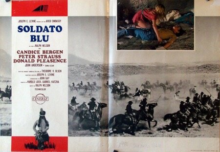 Ben più crudele e allusivo “Soldato Blu” di Ralph Nelson, che modifica sensibilmente la trama del libro “Arrow in the Sun” di Theodore V. Olsen, romanzo a lieto fine che sugli schermi ha una conclusione opposta. Il soldato Honus Gant (Peter Strauss) un contadino diplomato maestro elementare e infine arruolato nell’esercito, è l’unico superstite di un plotone che scorta le paghe della truppa a Fort Reunion. Osservando da un’altura i Cheyenne di Lupo Pezzato (Jorge Rivero) che massacrano le Giacche Blu guidate da un ottuso tenente Spingarn (Martin West) viene raggiunto da Cathy Lee (Candice Bergen) una donna bianca che è stata prigioniera degli Indiani e moglie di Lupo Pezzato.