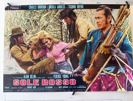 Un’idea originale è anche quella che sta alla base di “Sole rosso” (“Soleil rouge”) produzione italo-franco-spagnola, diretto da Terence Young, che mette insieme un cast davvero multietnico: l’americano di origine lituana, con sangue tartaro, Charles Bronson (Link) i francesi Alain Delon (Gauche) Capucine (Pepita) e Luc Merenda (Chato) il giapponese Toshiro Mifune (Kuroda) e la svizzera Ursula Andress (Christina).
