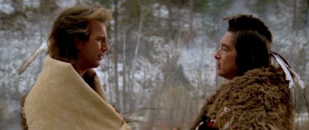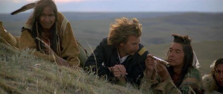 La solitudine iniziale del soldato, dopo la scoperta che il forte è stato evacuato dalle truppe a sua insaputa, si trasforma in una sorta di meditazione, di dialogo con l’ambiente ancora primitivo che lo circonda, con il proprio cavallo Cisco e con un lupo isolato, da lui battezzato Due Calzini per lo strano disegno delle sue zampe anteriori, che viene puntualmente a fargli visita. Il suo nome – Balla-Coi-Lupi – gli verrà affibbiato dai Sioux per averlo visto danzare intorno al fuoco insieme al suo nuovo amico a quattro zampe. Tutto, ad un certo punto, assume i risvolti di una dimensione magica, che l’America civilizzata ha ormai cancellato, nella quale Dunbar si sente rinato ad una nuova vita. “Ciò che gli poteva mancare era nulla in confronto a ciò che aveva” scrive Blake nel suo libro “La sua mente era libera. Non c’era divisione fra dovere e piacere. Tutto era uguale e non lo trovava per niente noioso. Era separato ed era tutt’uno allo stesso tempo. Era una sensazione meravigliosa.” (Blake, op. cit., p. 49).