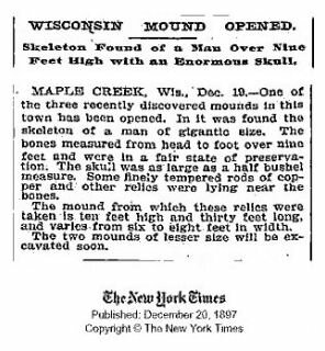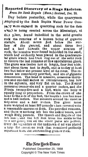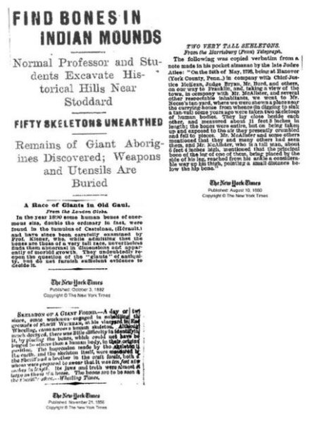 Abbandonando la mitologia e tornando ai ritrovamenti “insoliti” negli Stati Uniti, va detto che Lovelock Cave non costituisce un unicum. Nel corso del XIX secolo, e anche nei primi anni del ‘900, furono molti i ritrovamenti di ossa “di enormi proporzioni” che salirono agli onori della cronaca, venendo talvolta citati anche da fonti autorevoli come il New York Times. Dall’Ohio al Wisconsin, dal Nevada al New Mexico, dalla Pennsylvania allo Stato di Washington, esistono decine e decine di articoli giornalistici dai titoli roboanti quali: “Giganti stupefacenti”, “Scoperti teschi giganteschi”, “grotta nascosta rivela una scoperta sorprendente”. Si tratta, in genere, di articoli sensazionalistici, che non hanno alcun seguito, e, in alcuni casi, di vere e proprie bufale montate ad arte con rudimentali fotomontaggi.