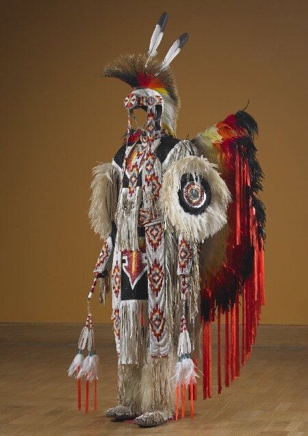 I REGALIA – Le tenute per la danza indossate nel cerchio durante il Pow Wow vengono chiamate regalia o semplicemente tenute. Nonostante siano altamente decorate, non ci si riferisce mai a queste tenute chiamandole “costumi”. Il termine costume denota artificio e un vestito che viene indossato per un evento che non fa parte della vita di tutti i giorni di una persona. Al contrario, queste tenute dei Nativi Americani sono molto personali e un’espressione artistica delle vite, dei sentimenti, degli interessi, della famiglia, e della ricerca spirituale dei danzatori. Spesso elementi dei regalia sono doni ricevuti dagli anziani o da persone considerate speciali nelle vite dei danzatori e sono onorificenze da portare con orgoglio e responsabilità. I regalia evolvono e cambiano mentre il danzatore evolve e cambia nel corso della sua vita. In ciascuna stagione vengono apportati dei cambiamenti a seconda della moda del momento o del personale cambio di gusto. Non vi è alcuna contraddizione nel fondere assieme elementi storici con elementi molto moderni, per esempio intrecciando il lavoro tradizionale di perline con ferma trecce di Minnie Mouse.