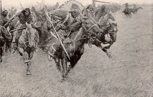 “Non ci fu mai uno spettacolo più maestosamente barbarico. Negli anni a seguire sono stato lieto di avervi assistito. Centinaia di guerrieri, il fiore dei combattenti delle tribù del Sudovest, montati sulle loro migliori cavalcature, armati di fucili e lance e protetti da pesanti scudi di spesse pelli di bisonte, scendevano come il vento. Su tutto si spandevano i ricchi colori del rosso, del vermiglio e dell’ocra, sui corpi degli uomini, sui corpi dei cavalli in corsa. Scalpi pendevano dalle briglie, meravigliosi copricapi sventolavano le loro piume, piume splendevano sospese alle code e alle criniere dei cavalli, e i corpi bronzei e seminudi dei cavalieri rilucevano di ornamenti d’argento e ottone. Dietro a questa armata lanciata a capofitto nella carica si stendevano le Pianure, sul cui orizzonte il sole nascente levava i suoi fuochi mattutini. I guerrieri sembravano emergere da questo scenario raggiante”.