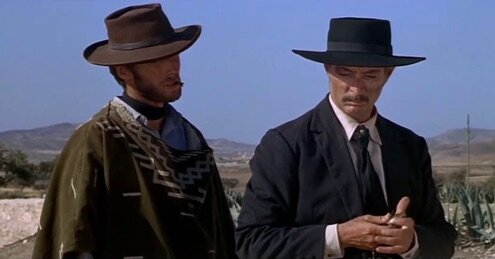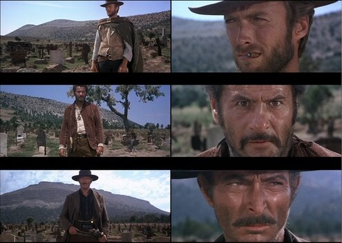 Con “Il buono, il brutto, il cattivo”, ultimato nel 1966, il binomio cambia, pur rimanendo sempre sul piano del reciproco tornaconto. Eastwood, che ora si fa chiamare Biondo, è ancora nei panni del bounty-killer dagli occhi di ghiaccio, mentre Van Cleef viene sostituito dal chiassoso, petulante e a tratti insopportabile Eli Wallach. Al signorile contegno del colonnello subentra la volgarità del rozzo Messicano, che già aveva interpretato il bandito Calvera ne “I magnifici sette”. “La violenza esasperata viene stemperata da continui richiami ironici e beffardi” (Moscati, op. cit., p. 37) e il film alterna fasi di estrema drammaticità, come i reiterati scontri fra Nordisti e Sudisti per la conquista di un ponte, a momenti che rasentano la comicità, quasi sempre dovuti alla presenza di Tuco.