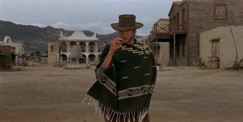 La conclusione del film sembra addirittura ovvia: Joe lascia il villaggio ormai liberato dagli oppressori (e rimasto praticamente deserto) per una destinazione ignota. Il personaggio, che non ha rivelato nulla di sé, ha fatto centro, catturando l’attenzione di un pubblico abituato generalmente ad assistere al trionfo degli eroi della leggenda. Eastwood non è un eroe, non è neppure un uomo destinato a compiere una missione umanitaria e neanche una persona che intenda vendicare dei torti. Al contrario, è un soggetto che bada agli affari suoi, senza però cedere a soprusi e prepotenze, che si muove in groppa ad un mulo invece che in sella ad un cavallo di razza e che puntualmente, poco prima di seminare la morte con la pistola, si accende un mozzicone di sigaro (Eastwood detesta il vizio del fumo, ma accetta l’imposizione perché rientra nel copione). Il suo abbigliamento sarebbe del tutto ordinario, se non fosse per il poncho messicano che indossa, una sorta di divisa a cui nessun altro regista aveva pensato prima. Ma le grandi innovazioni di Leone sono soprattutto i primi piani dilatati e insistiti fino all’esagerazione per evidenziare l’espressione di pietra del protagonista e le emozioni e i difetti dei suoi antagonisti, dal volto butterato di don Benito Rojo (Antonio Prieto) fratello maggiore di Ramon, a quello scettico dell’oste Silvanito (Josè Calvo) che parteggia per Joe.