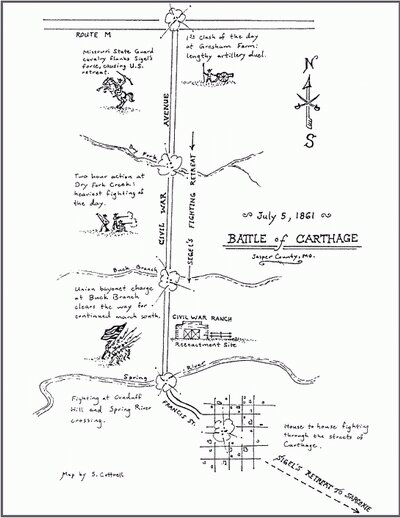 Avuta notizia della presenza di Jackson nei dintorni del piccolo villaggio di Carthage a Sud-Ovest di Springfield, dopo una marcia di 20 miglia Sigel porta i suoi uomini in quelle vicinanze, giungendovi la sera del 4 Luglio. Il campo viene allestito a sud-est di Carthage vicino allo Spring River, un fiumiciattolo che passa nelle vicinanze. Alcuni reparti di cavalleria sudista sbucano dalle alture nelle vicinanze e spiano avidamente, tenendosi fuori tiro, le postazioni nordiste: infatti uno dei principali compiti della cavalleria nella Guerra Civile era quello di eseguire ricognizioni in forze, spiando attentamente le mosse e la consistenza dell’avversario.