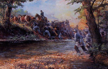 Sigel, temendo che le squadre di cavalleria penetrate alle sue spalle potessero circondarlo e catturare il suo “baggage train” ordina che un pezzo di artiglieria e una compagnia del III° reggimento si portino immediatamente dietro il Dry Ford Creek a protezione dei veicoli da trasporto.