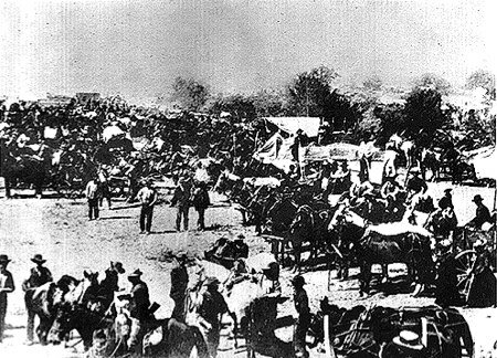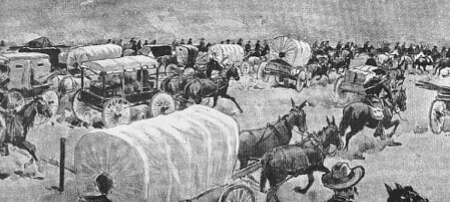 Per quelli che avrebbero usato i loro mezzi di trasporto, c’era ogni mezzo eccetto i palloni. A Caldwell, verso nord, ci fu anche un carro che trasportava una casa già pronta fatta in lamiere di ferro, completamente equipaggiata con polli, bestiame e altri animali domestici.