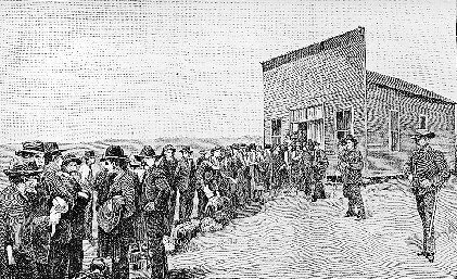L’ufficio federale per le concessioni fu assediato, sia a Kingfisher che a Guthrie. All’esterno di entrambi apparvero mostruose file poiché le persone restavano in attesa di solito per giorni per registrare le loro terre. Alcuni intraprendenti restavano in fila solo per rivendere ad altri il loro posto.
