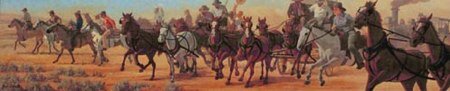 Essi aspettavano con in mano le briglie dei purosangue, nei calessini con i bordi ornati, nella prateria carri coperti pavesati con ceste di polli e mucchi di attrezzi agricoli, accanto a testardi, resistenti muli del Missouri, insieme a cigolanti carri trainati da squadre di buoi. Alcuni, decisi e determinati, sarebbero andati a piedi, sperando che qualcosa sarebbe rimasto per loro. Incredibilmente, un pugno di anime ardite mostrò grande fede nel loro senso di equilibrio arrischiandosi nella prateria inforcando delle alte, malferme biciclette a ruote alte.