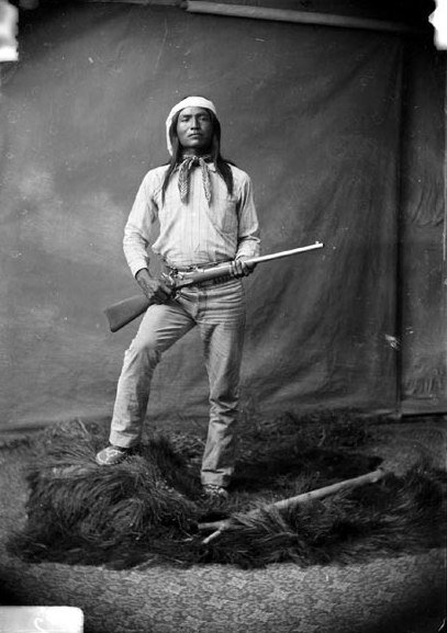 Apache Kid, figlio maggior di Toga-de-chuz della banda Aravaipa di capitan Chiquito, nacque in Arizona verso il 1860. La storia di quest’uomo si può considerare atipica, nel senso che durante le guerre Apache non fece parte della resistenza. Al contrario ed uguale ad altri Apache, fin dalla giovane età servì nelle unità ausiliarie dell’esercito nordamericano. Nel 1875 John Clum, l’agente designato dal governo, trasferì la sua banda nella riserva di San Carlos. Il giovane Apache passò un certo tempo nell’accampamento minerario di Globe, dove ebbe vari impieghi, apprese l’inglese e cominciò a vestirsi come i bianchi. Nel 1879 il Kid conobbe il famoso capo degli scouts Apache Al Sieber e, due anni più tardi, si arruolò tra gli scouts. Il Kid servì con distinzione in queste unità ausiliarie, arrivando al grado di sergente. Partecipò alla campagna del 1882 contro gli Apache Coyoteros e White Mountains. Nel settembre del 1886 era presente alla stazione ferroviaria di Fort Bowie (Arizona), quando la banda di Geronimo fu inviata in Florida. Le disavventure del Kid cominciarono nell’inverno del 1887, quando suo padre venne assassinato da un membro della sua stessa banda. Nonostante alcuni amici uccidessero l’assassino, i desideri di vendetta portarono il Kid ad uccidere anche il fratello di questi. Dopo, il Kid e i suoi amici lasciarono la loro unità dell’esercito senza permesso e, di ritorno all’accampamento, vi fù una rivolta, durante la quale Al Sieber venne colpito da una pallottola che lo lasciò zoppo per tutta la vita. Sieber accusò il Kid, e nonostante le testimonianze affermassero che lo scout era innocente, questi fù sottoposto a giudizio e sentenziato a morte insieme ad altri 4 Indiani. Ma il general Nelson Miles contestò la decisione, ottenendo che il tribunale la riconsiderasse, così gli uomini furono condannati a dieci anni nella prigione di Alcatraz (California). Nel 1888 da Washington, si ordinó la messa in libertà del Kid e 4 dei suoi compagni. Di nuovo in Arizona, le autorità ordinarono l’arresto di diversi Apache, incluso il Kid. Furono sentenziati a 7 anni di prigione a Yuma. Durante il viaggio verso il famigerato penitenziario, Apache Kid e altri otto prigionieri Apache, riuscirono ad uccidere lo sceriffo e il suo aiutante, fuggendo sui monti. A partire da questo momento, il Kid diventò uno dei banditi più famosi e ricercati dell’Arizona. Apache Kid riuscì a riunire una piccola banda, che commetteva incursioni tra la frontiera di Sonora e Arizona. Durante la decade del 1890, il Kid e altri Broncos uccisero diversi messicani e statunitensi.