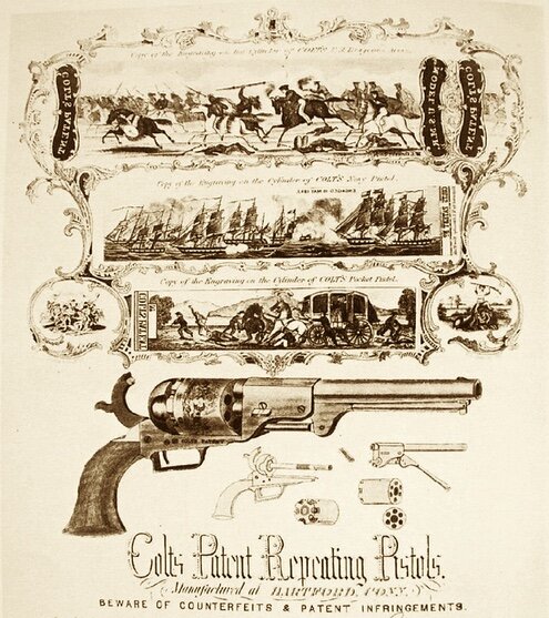 Samuel Colt realizzò ben presto che i suoi innovativi revolvers potevano essere abbelliti con delle ricche ed artistiche incisioni secondo un consolidato costume ereditato dalle epoche precedenti dapprima sulle armi bianche e poi da fuoco fini e da regalo.