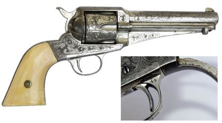 Vi sono dei rari esemplari molto belli incisi e con guancette in materiali pregiati come quello sotto raffigurato, matricola 7629 cal. 45 Colt.