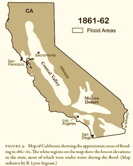 William Brewer della California Division of Mines and Geology scrisse: “Quasi tutte le case e le fattorie di questa immensa regione sono scomparse. L’America non ha mai visto una tale desolazione causata da un diluvio”.