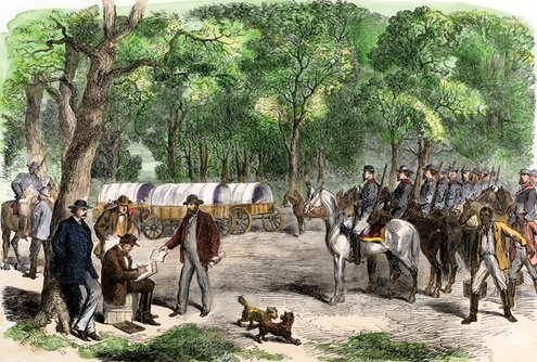 Davis era all’interno di una tenda con sua moglie e sentì degli spari. Ipotizzò che si trattasse di banditi e ce ne erano, persino di ex confederati che avevano pianificato di rapinare la carovana della signora Davis nelle precedenti settimane, però quando aprì la tenda vide le giacche blu.