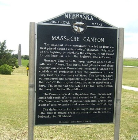 La battaglia di Massacre Canyon, combattuta il 5 Agosto 1873, Martedì, fu l’ultimo grande scontro delle guerre intertribali nell’Ovest americano. In questo remoto angolo del Nebraska sud-occidentale forze preponderanti di guerrieri brulè e oglala assalirono il contingente di circa 350 Pawnee, uomini, donne e bambini, recatisi nel bacino del fiume Republican per quella che sarebbe stata la loro ultima caccia al bisonte sulle pianure. Oggi, due miglia a est di Trenton, Hitchcock County, si erge un obelisco di granito, fatto apporre dal governo americano a ricordare quei tragici fatti all’interno dell’odierno parco. Mezzo miglio più a ovest la Highway 34 si incurva all’interno del Canyon, percorso da un torrente che a sud si svuota nel Republican; due miglia più a monte il Canyon si abbassa e restringe e lì si svolse l’attacco.
