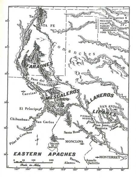 A est del Faraones vi erano i “Sejen-ne”, meglio noti come “Mescaleros”, una popolazione delle aree montuose del Pecos River che si estendeva a nord su entrambe le rive del fiume. Uno dei grandi problemi dell’Ugarte fu sicuramente quello di mantenere la pace con questo gruppo e con i loro nemici storici, i Comanches. La forte pressione operata da questi ultimi avrebbe portato i Mescaleros a spingersi a sud e ad attaccare gli insediamenti coloniali del Coahuila e della Nuova Vizcaya. Come i “Llaneros”, o “plains Apaches”, i Mescaleros decisero allora di posizionare i loro campi in prossimità delle montagne – come d’altronde i Faraones -, per fronteggiare meglio i Comanche ed anche gli spagnoli stessi. Le fonti riportavano che, durante l’amministrazione dell’Ugarte, i Mescaleros avevano otto bande guidate da ben noti leader come “Bigotes el Bermejo” (Whiskers o the Crimson One), “Cuerno Verde” (Green Horn), “Montera Blanca” (White Cap), “El-lite” (“El Quemado” o the Burnt One), “Daxle Ylchí” (“Patule” el Grande), “Quijiequsyá” (“Zapato Tuerto” o Twisted Shoe), “Gabié-choché” (“Alegre” o Happy), e infine “Yco-Yndixle” (“Volante” o “Ligero”, Rover o Flighty). Gli indiani “Cuelcajen-ne”, noti come “Llaneros”, erano i gruppi stanziati nelle pianure e nelle aree sabbiose tra il Pecos e il Colorado River, nel Texas; questi gruppi occupavano aree confinanti con i Mescaleros, a ovest, i Lipanes a est, gli insediamenti spagnoli del Coahuila a sud, ed infine con i Comanches a nord.