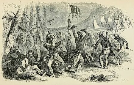 Nel 1671-1672, una banda di Huron, alleata con una banda di Ottawa, si diresse contro i Sioux. Attraversando l’area di Green Bay nel loro percorso verso i Sioux, i guerrieri Huron-Ottawa, con l’aiuto di regali, attirarono alcuni guerrieri Fox, Sauk e Potawatomi a unirsi a loro, portando la forza della spedizione a circa 1.000 guerrieri. La maggior parte di questi guerrieri era armata con armi da fuoco e munizioni fornite dagli Uroni e dagli Ottawa, avendo essi stessi ottenuto queste munizioni dai Francesi a Montreal. Dopo aver raggiunto i primi piccoli villaggi Sioux, catturarono alcune delle donne e dei bambini Sioux e scacciarono i guerrieri dei villaggi. La voce degli attacchi si diffuse rapidamente tra le altre comunità Sioux vicine. Un gran numero di guerrieri Sioux entrò presto in azione e si vendicò contro gli aggressori, mettendo rapidamente in fuga i guerrieri Huron-Ottawa-Fox-Sauk-Potawatomi. I guerrieri Fox, Potawatomi e alcuni Kishkakon (il clan Orso degli Ottawa), essendo un po’ meno abituati ai pericoli della vera guerra, fuggirono alla vista degli sciami di guerrieri Sioux infuriati in arrivo, perdendo quindi pochissimi dei loro stessi guerrieri. Al contrario, gli Uroni, i Sauk e il corpo principale di Ottawa, essendo più coraggiosi, inizialmente mantennero la loro posizione. Ciò concesse agli altri il tempo di scappare, ma portò le vittime Huron, Sauk e Ottawa a essere molto più alte di quelle dei loro alleati che erano fuggiti, con il risultato che i primi furono quasi annientati. La ritirata dai furiosi e travolgenti guerrieri Sioux divenne una tale disfatta che molti degli Uroni, Sauk, Fox, Potawatomi e Ottawa che fuggivano gettarono via le loro armi per accelerare la loro fuga. Un capo Ottawa, essendo stato catturato dai Sioux, fu torturato fino alla morte, gli furono tagliati pezzi di carne che, bollita, gli fu fatta ingurgitare a forza. Anche suo cognato, il capo dei Sauk che lo aveva accompagnato contro i Sioux, fu torturato e nutrito allo stesso modo fino alla sua morte. Altri guerrieri Huron, Potawatomi e Sauk catturati furono giustiziati dai Sioux con le frecce. Nei giorni che seguirono la disfatta, la privazione di coloro che riuscirono a fuggire nelle terre selvagge fu così grave che alcuni furono persino costretti a mangiarsi a vicenda.