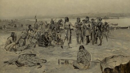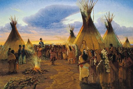 Le cose iniziarono abbastanza bene. In una mattinata limpida che prometteva buona fortuna, i visitatori americani scelsero un comodo banco di sabbia, eressero una tenda per ripararsi sotto il sole di mezzogiorno, issarono la bandiera della repubblica e aspettarono che arrivassero gli Indiani. Niente di nuovo qui; Lewis e Clark avevano già organizzato la loro rappresentazione presso altre tribù e lo avrebbero fatto di nuovo nei prossimi mesi. Verso le 11 apparvero i capi Brulé e il loro seguito. Ciò che seguì fu una notevole miscela di rituali diplomatici nativi americani ed euroamericani. Ciascun gruppo nutriva l’altro, e i Sioux portavano “grandi quantità di carne”. A mezzogiorno il pasto era finito e si poteva iniziare a parlare. Avendo lasciato Pierre Dorion con gli Yankton Sioux, Lewis e Clark ora riconoscevano che mancava loro un interprete affidabile. Ciò nonostante, il Consiglio andò avanti. Ci fu del fumo “gradevole all’uso comune” e poi Lewis pronunciò il suo discorso standard. Se questo incontro avesse seguito il modello di altri – e questa sembra una buona ipotesi – Lewis annunciò la sovranità americana, disse ai Sioux che avevano un nuovo grande padre, promise buoni rapporti commerciali con i mercanti di St. Louis e sollecitò la pace con i vicini nativi.