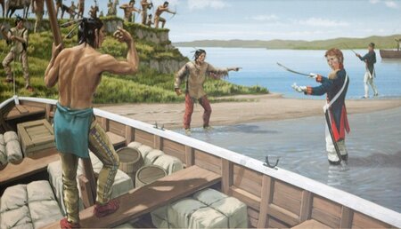 Il primo giorno dell’incontro di quattro giorni tra i Teton Sioux e il Corps of Discovery, un guerriero della banda del Partigiano strinse le braccia attorno all’albero della chiatta, mentre Clark estraeva la spada e avvisava gli uomini di stare pronti ad agire.
