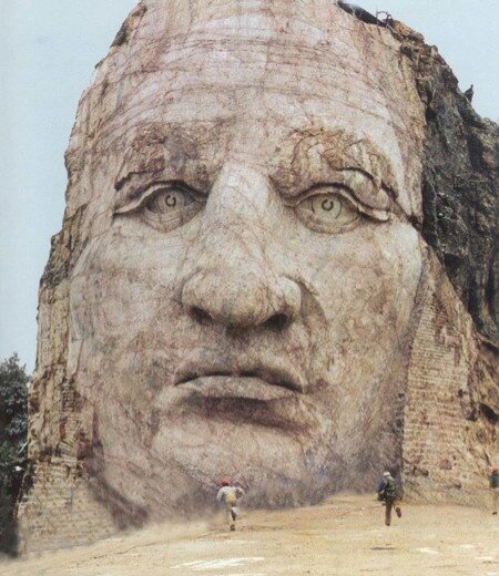 Tutto ciò per far meglio risaltare la differenza tra i bianchi che con i soldi del Governo e centinaia di lavoratori in soli 14 anni hanno realizzato le statue del Monte Rushmore, ed i Nativi che, con le loro sole forze, stanno realizzando un’impresa letteralmente titanica.