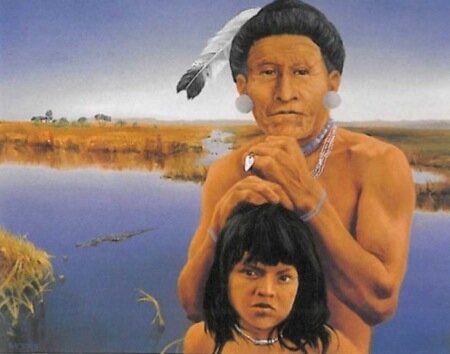 La residenza del capo, chiamato “paracoussi”, si trovava nelle zone di Cape Canaveral (Corientes), ma il loro territorio si estendeva anche alla odierna St. Lucie County. I Tekesta, il cui significato del nome è sconosciuto, erano strettamente affini alle altre popolazioni della Florida meridionale e, in particolare, ai Calusa; stanziati nelle zone di Miami, sembra avessero ben quattro insediamenti, ma sorgono alcuni problemi in quanto alcuni di questi potevano invece appartenere ai Jeaga, li elenchiamo comunque a partire dal sud verso nord: “Tavuacio”, “Janar”, “Cabista” e “Custegiyo”. Secondo il Romans, nel 1763, i resti dei Tekesta si sarebbero spostati a Cuba. Il grande lago “di acqua dolce” (Mayaimi) si trovava nell’interno del paese ed era occupato dagli indiani Mayaimis che vivevano intorno al grande lago Okeechobee, proprio nell’area che dette vita alla “Glades Culture”; essi prendevano il nome dall’omonimo lago, infatti il termine significava “grande acqua” sia nel loro dialetto che nelle lingue dei Calusa e dei Tekesta (“Tequestas”). Con l’arrivo dei bianchi i Mayaimis si sarebbero ridotti drasticamente fino a scomparire dalla scena storica. Ben poco sappiamo sugli indiani delle Keys Island, ma sembra che queste isole abbiano dato rifugio a indios provenienti dalle isole caraibiche; comunque, le prove archeologiche non sono affatto conclusive, e tranne il generale riferimento di alcuni viaggiatori europei che parlavano degli indiani Matecumbes delle Keys Island (Alonso Suarez, 1586), nella zona si potevano trovare anche i Bahiahondas, i Cuchiagaros, i Coleto e i Biscaynos dell’omonima baia. Il nome dei Matecumbes, con le sue varie ortografie, compare in varie fonti spagnole, dove essi venivano localizzati in una terra chiamata “los Cayos de Matecumbe”. Sulle isole erano però presenti anche i Calusa e i Tekesta. Alcuni indiani delle “isole dei Jeaga, che stanno all’inizio delle Bahamas” avevano detto allo spagnolo che Lucas Vasques de Ayllon, proveniente da Santo Domingo con sei navi, aveva “visitato questo paese e le terre del fiume San Elena (St. Helena) posto sei leghe a nord, sulle rive del quale vi era il villaggio di Orista, chiamato erroneamente Chicora”; poi continuava dicendo che l’Ayllon aveva visto “il villaggio di Quale, che loro chiamarono Gualdape”, ma poi ricordava che quella spedizione non si spinse nell’interno del continente, probabilmente perché sapevano che non vi era né oro né argento “nel raggio di 60 leghe”, ma soltanto miniere di rame verso nord. Il villaggio di “Orista” si trovava nelle zone di St. Helena (South Carolina) e apparteneva alla tribù Escamacu, probabilmente del gruppo Guale; il villaggio di “Quale” (“Gualdape”) si trovava anche esso nel South Carolina e dal nome è facile riconoscere l’omonima tribù Guale. Gli indiani Guale, il cui significato del nome è sconosciuto, benché assomigli a “wahali”, un termine Muskhogean significante “il sud”, erano anche noti come “Ouade” (una forma francese per Guale) ed altre forme dialettali. I nomi dei loro insediamenti e il titolo onorifico di “mico” indicava chiaramente la loro appartenenza ai gruppi Muskhogean e i loro stretti collegamenti con i Cusabo del South Carolina. La tribù era stanziata sul litorale della Georgia fra il Sound di St. Andrews e il fiume Savannah, benché un ramo fosse presente anche più a sud; i resti dei Guale sarebbero poi stati assorbiti all’interno della nazione Creek e l’ultima menzione della tribù si ebbe nel 1726, quando si parlava di “indiani della nazione di Iguaja”. ” Sulle rive di alcuni fiumi e di alcuni laghi vi erano i villaggi indiani di Otopali, Olgatano e molti altri “. I due villaggi di “Otopali” e “Olgatano” non vengono ricordati dallo Swanton, ma secondo alcuni studiosi sembra siano appartenuti alla tribù Yustaga. Gli Yustaga, il cui significato del nome è ancor oggi sconosciuto, erano strettamente connessi ai gruppi Timucuan, anche se il loro dialetto sembra essere stato differente; la tribù era stanziata tra i fiumi Aucilla e Suwannee, ma anche lungo le coste adiacenti. Il Fontaneda ricordava anche il “paese di Abolachi ricco di perle e non lontano da Panuco” e riferiva che, “tra Abolachi e Olagale vi è un fiume che gli indiani chiamano Guasaca-Esgui, che tradotto nella nostra lingua significa il Fiume Rosso”. Questi riferimenti restano comunque poco attendibili: di “Abolachi” sappiamo che probabilmente, con questo nome, lo spagnolo indicava gli Apalachee, mentre “Olagale” sembra essere la “Ocale” dell’Hernando de Soto. Degli indiani “Ocale”, il cui significato del nome è sconosciuto, ben poco conosciamo, anche se in questo gruppo vi sarebbe poi entrato una banda di indiani Creek proveniente dal villaggio di “Coweta”. La tribù era originariamente collegata al gruppo degli Acuera ed era stanziata nella parte settentrionale della Marion County e sulla curvatura del fiume Withlacoochee. Gli Acuera, il cui significato del nome è sconosciuto, erano di etnia Timuquan ed erano stanziati presso la fonte del fiume Ocklawaha della Florida settentrionale. A “Tocobajo” risiedeva un grande Cacique, il cui paese era conosciuto come “Toco-Baja-Chile”.