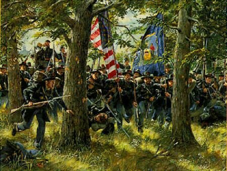 Al calar del sole, dopo ore di attesa sotto il crepitio dei moschetti e i colpi di cannone che squarciano gli alberi, arriva un cavaliere con un ordine perentorio: “Attaccare!” Gibbon manda avanti gli “schermagliatori”: una o due Compagnie che, celandosi, precedono in ordine sparso il Reggimento, allo scopo di “disturbare” la risposta del nemico.