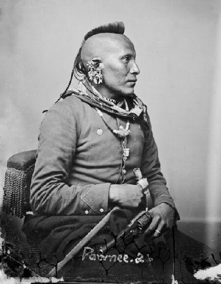 La nazione dei Pawnee era di ceppo “caddoan” e deve il suo nome (attribuito, come sempre, da altri popoli), forse, al termine “parika”, corno, con il quale si usava descrivere la particolare modalità di mantenere l’acconciatura, con il cranio completamente rasato sui due lati e con una sola striscia di capelli che, ingrassati debitamente, erano in grado di assumere forme diverse che ricordavano il corno, curvo e ripiegato indietro.