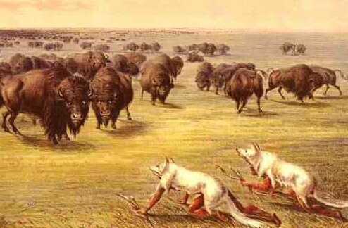 Prima dell’avvento del cavallo, la tecnica di caccia al bisonte prevedeva la messa in fuga della mandria verso un precipizio, nel quale sarebbe precipitata, o dentro ad un recinto dove sarebbe stata annientata con facilità. Veniva utilizzato un uomo con indosso la pelle di un bisonte che attirava la mandria nella direzione voluta. Il ruolo di chiamatore di bisonti non solo richiedeva la perfetta conoscenza del comportamento di questi animali, ma anche una grande resistenza ed abilità. Camuffato da bisonte il chiamatore, con il suo comportamento e la mimica, doveva piano piano stimolare, attrarre e convincere i capi della mandria ad andare verso di lui e verso il dirupo. Una volta che la mandria era ben avviata nella direzione voluta, gli altri indiani uscivano dai nascondigli collocati lungo i fianchi del percorso ed urlando la mettevano in fuga verso il precipizio. Questo modo di cacciare non era nè selettivo nè stagionale ed il bisonte non era il perno attorno a cui ruotava l’intera vita degli indiani. Nel burrone o nel recinto capitavano animali giovani e vecchi, sani e malati, tori,vacche e vitelli, scarsi o abbondanti secondo la mandria individuata ed il periodo dell’anno. I cacciatori indiani a piedi avevano gravi problemi logistici e per questo spesso si adattavano anche all’agricoltura e praticavano una cacciagione varia e diversificata. Con l’arrivo del cavallo si ebbe una vera e propria rivoluzione nel rapporto indiano-bisonte. Con il cavallo l’indiano aveva acquistato velocità e capacità di movimento. Poteva cercare le mandrie in tutta la prateria ed una volta individuati i bisonti, poteva selezionare il sesso, l’età, nonchè la quantità degli animali da abbattere secondo le sue necessità.