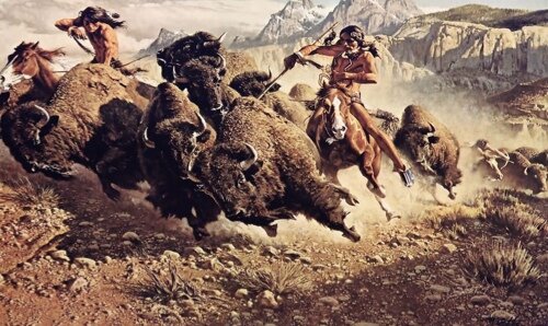 Quando gli indiani scorgono in lontananza la mandria dei bisonti si tiene un conciliabolo sul modo di condurre l’attacco. Trovato l’accordo sull’azione di accerchiamento, i cavalieri, armati di arco, frecce e lancia montano i loro cavalli appositamente addestrati alla caccia del bisonte e si dividono in due colonne prendendo opposte direzioni. Piano piano si dispongono attorno alla mandria, ad una distanza di circa due chilometri, formando un cerchio di cavalieri equidistanti fra loro. I cacciatori devono mantenersi sempre sottovento per evitare che l’odore dei cavalli e dell’uomo metta in allarme i tori adulti che coprono i fianchi della mandria,per proteggere le femmine ed i vitellini che si trovano al centro. Poi ad un segnale convenuto, lentamente stringono verso il centro. La mandria,che prima non aveva nessun sospetto, ora sente il vento, avverte cioè l’approssimarsi del nemico e si da alla fuga in una confusione enorme. Intanto i cavalieri hanno stretto i ranghi in tutte le direzioni e formano una linea interrotta intorno ai bisonti che, terrorizzati girano in tondo scalciandosi ed urtandosi a vicenda.