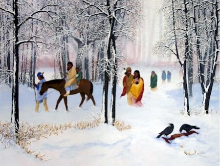 Ma un’altro trasferimento iniziò invece con i primi freddi e fu portato avanti in mezzo a pioggia, fango e neve persistenti. Le sofferenze furono inenarrabili e ad esse si sommarono le tragedie causate dai banditi che frequentemente assaltavano i carri delle famiglie di Cherokee lungo la pista. L’inedia, il cibo avariato, le malattie ed i maltrattamenti fecero il resto in quello che sarebbe stato ricordato come “Il Sentiero delle Lacrime”. I soldati incitavano i conducenti a non fermarsi mai, per tenere il passo con i primi carri della interminabile colonna e in questo modo non vi era neppure modo di seppellire i morti che venivano lasciati lungo la strada.