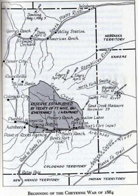I problemi per il Governatore Evans cominciarono alla fine di marzo del 1864. L’Agente Indiano Colley gli spedì una lettera in cui lo informava che vi era l’evidenza di una nuova rivolta indiana. Cheyenne, Arapahoes e Sioux intendevano assalire ogni uomo bianco tra Kansas City e Denver nei mesi a venire. Nel mese di aprile scoppiarono le prime ostilità. Il 9 un gruppo di razziatori attaccò un ranch vicino a Julesberg, nel nordest del Colorado. I coloni fuggirono, ma gli Indiani rubarono il bestiame e i cavalli. Chivington inviò sulla scena il Maggiore Jacob Downing con l’ordine di recuperare il bestiame. Qualche tempo dopo, Downing telegrafò. Aveva incontrato un gran numero di Indiani nella zona e aveva bisogno di rinforzi.