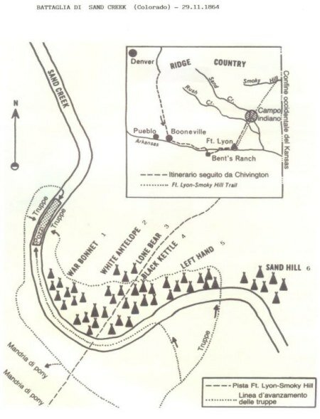 Il campo sul Sand Creek era composto da circa 115-120 tende, con una popolazione di 500-600 persone. Edmond Guerrier e John Smith, due mercanti che sposarono donne Cheyenne e che si trovavano nell’accampamento al momento dell’attacco, dissero che nel villaggio vi erano circa 200 guerrieri. Non pochi! Evidentemente non erano tutti lontani sulla pista del bisonte, come dice la famosa canzone di Fabrizio De Andrè… A causa del maggior numero di non combattenti, in gran parte degli assalti a villaggi indigeni (a partire dall’attacco a quello dei Pequots fino a Wouded Knee) il numero di morti fra i non combattenti fu superiore a quello dei guerrieri, dato che soldati di diverse nazioni, miliziani, regolari o irregolari, Rangers di Rogers o del Texas, sparavano, cannoneggiavano e mitragliavano nel mucchio, senza fare troppe distinzioni.