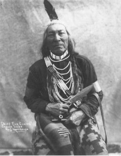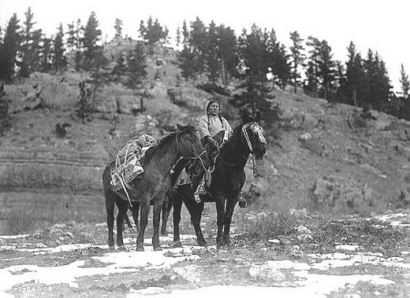 Un indiano Cayuse ritratto durante un trasferimento a cavallo