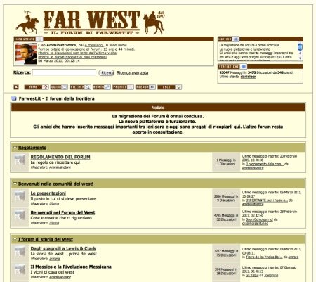 Carissimi amici e appassionati di storia del west, degli indiani e della guerra civile, con questa breve comunicazione vogliamo informarvi che da ieri sera il Forum di Farwest.it ha cambiato indirizzo. Ora lo trovate CLICCANDO QUI ed è pronto ad affrontare nuove sfide. Esattamente come facevano i pionieri e le tribù indiane, anche noi, dopo tanti anni, abbiamo deciso di guardare in avanti e rischiare di spostarci. Non solo, però, abbiamo caricato tutte le nostre cose – amici, discussioni, messaggi, immagini, abitudini e tradizioni – ma abbiamo persino cambiato struttura.