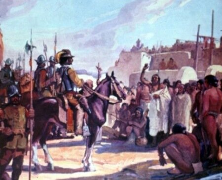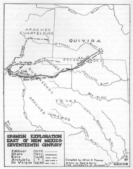 Quindi possiamo supporre che gli Aguacanes avevano villaggi permanenti che però lasciavano quando cacciavano i bisonti, proprio come succedeva fra gli indiani Pawnees del Nebraska. Dopo una lunga marcia verso oriente, seguendo il corso del fiume Canadian, l’Oñate si spinse verso la mitica “Quivira”, in direzione nord. Gli Aguacanes offrirono guide e condussero i bianchi fino in prossimità dei villaggi dei loro nemici Wichitas, dove gli spagnoli notarono subito vaste aree coltivate a mais. L’indiano fu molto utile agli spagnoli per le numerose informazioni riguardanti la geografia delle Pianure meridionali. Il Miguel delineò e descrisse la regione, le sue genti e gli intensi commerci nelle Pianure meridionali. Le indagini del Valverde, risalenti al 1602, servirono per chiarificare la vita nelle Pianure meridionali e, soprattutto, la geografia del territorio, molto utile per le future esplorazioni spagnole.