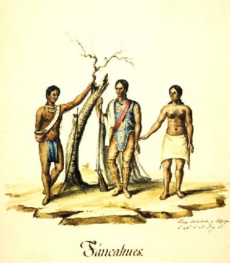 L’Anderson ritiene che l’uso comune di questi termini, simili a “Tawakonis”, presuppongono diverse varianti di questo nome, utilizzato probabilmente per indicare vari gruppi di etnia Wichitas che occuparono le terre dei fiumi Arkansas e Red River. Il Newcomb e il Campbell sono stati i primi studiosi ad affermare che gli “Aguacanes” fossero in realtà gli indiani Tawakonis. L’Anderson continuava dicendo che però, né i Tawakonis, né i Pawnees avevano dato origine alla nazione Escanjacques, ma però entrambi i gruppi avevano al loro interno discendenti appartenenti agli Escanjacques. Le descrizioni in nostro possesso su questa popolazione indicano chiaramente la loro affinità con i vari gruppi Wichitas; l’Oñate e i suoi cronisti ricordavano che si tatuavano il corpo e vivevano in “grande case” coniche “alte circa 10 piedi e poste in cerchio”, quindi un villaggio permanente. Il comandante diceva che alcune abitazioni “erano così grandi che avevano anche 90 metri di diametro, e la maggior parte di queste case erano ricoperte di pelli di bufalo”. Era indiscutibilmente una tribù di lingua Wichitas dedita alla caccia ai bisonti e vagante nelle terre poste a nord-ovest degli Hasinais. Il St. Denis li ricordava, nel 1713, con il nome “Quihuugans”, termine quasi identico al “Quichan” – riconducibile alla tribù Wichitas – del Bernard de La Harpe; ma anche ai Kichais e ad un grande gruppo chiamato “Canohatinos”. Quando il Newton e il W.T. Field hanno analizzato il “Journal” del La Harpe si sarebbero resi conto che gruppi Wichitas erano localizzati a sud del Red River nell’anno 1719. Però, essi, come altre studiosi dei gruppi Wichitas, non hanno trovato alcun documento storico, soprattutto francese, che menzionasse l’esistenza di bande Wichitas a sud del Red River a partire dal 1685; inoltre, i due studiosi, identificano i “Quichuan”, ovvero i “Quihuugan” del St. Denis, come un gruppo Wichitas. Abbiamo a disposizione anche un breve resoconto di questi primi cacciatori nomadi di bisonti, esso ci viene dal “Journal” dell’abate Jean Cavelier, fratello del La Salle, il quale, nella primavera del 1686, accompagnò il comandante in una breve spedizione esplorativa nelle pianure meridionali subito dopo lo stanziamento francese sulle coste texane. E’ probabile che nelle pianure del corso centrale del Brazos i francesi incontrarono cacciatori di bisonti che il Cavelier identificò come “indiani Kanoatinoa”, in seguito chiamati “Canohatinos” dal Saint Denis.