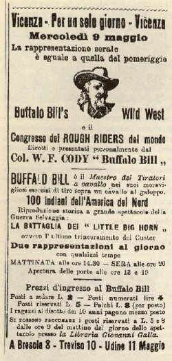 Il Wild West Show di Buffalo Bill, Cody, venne in italia 2 volte, rispettivamente nella seconda tournèe Europea, del 1890, e nella terza tournèe, del 1906.