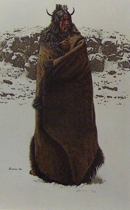 Un guerriero con la classica coperta di pelle di bisonte