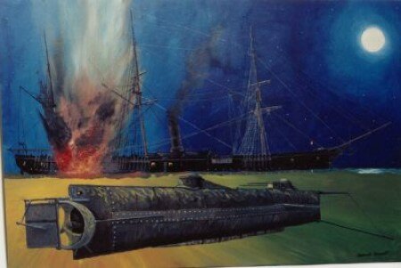Da tempo un costruttore navale di Mobile, Alabama, tale Hunley, aveva ideato e fabbricato un battello sottomarino. In immersione, veniva azionato da un sistema di manovelle che ne muovevano l’elica: doveva recare, come i DAVID, un ordigno esplosivo in cima ad un’asta. Le prime prove del sommergibile furono poco buone. Sperimentato in acque poco profonde, per ben due volte si piantò nella mota della baia di Charleston e l’intero equipaggio perì. Ma un audace, il tenente Dixon, si offerse di portare egualmente lo HUNLEY ( così chiamato, dal nome del suo costruttore, perito in uno dei due esperimenti) contro la flotta nemica.