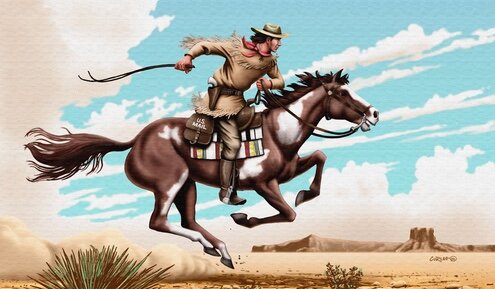 Eccolo che arriva! “In fondo alla piatta e sterminata distesa della prateria si materializza contro il cielo un puntino che avanza verso di noi ad andatura travolgente. Si levano grida, acclamazioni e poi cavallo e cavaliere sfrecciano davanti ai nostri volti eccitati e si allontanano come una sorta di uragano in miniatura”. Così lo scrittore Mark Twain, in viaggio nel West, descrive il passaggio di un corriere del Pony Express.