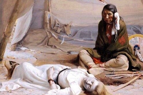 Cynthia Parker mentre allatta la figlia e Quanah, altro suo figlio, capo dei Comanche